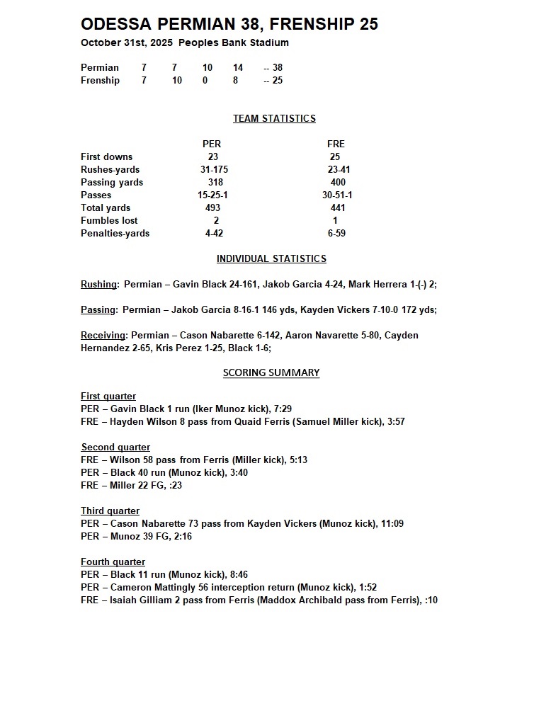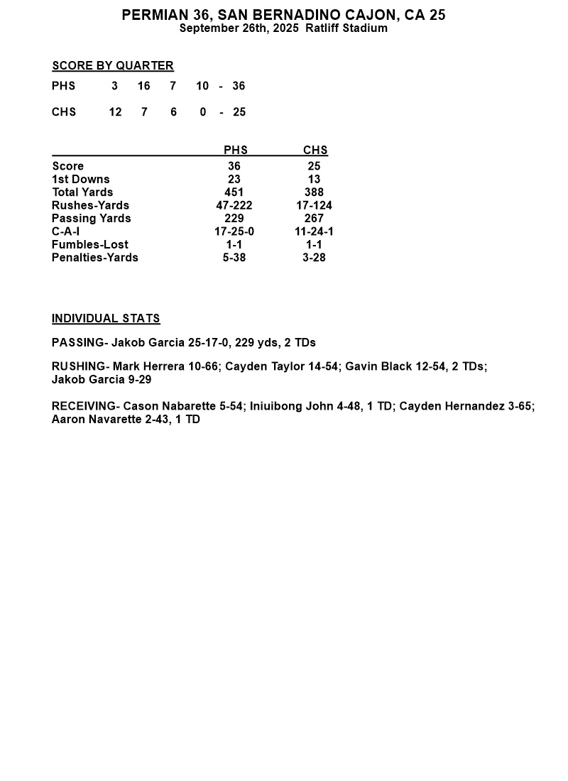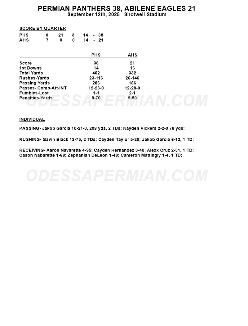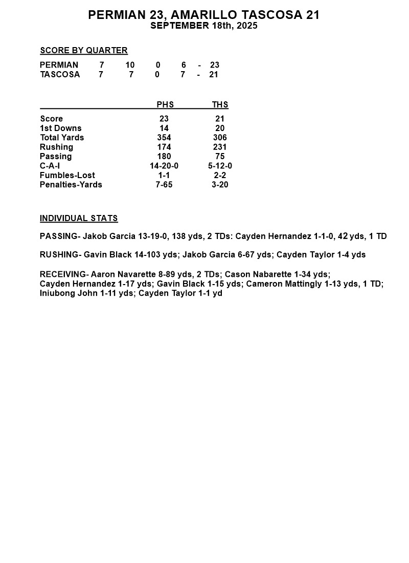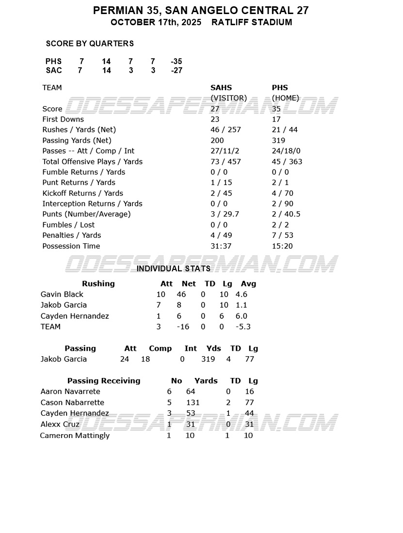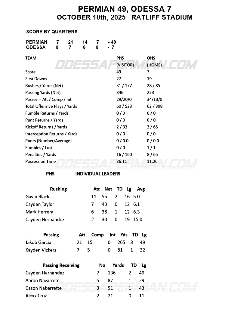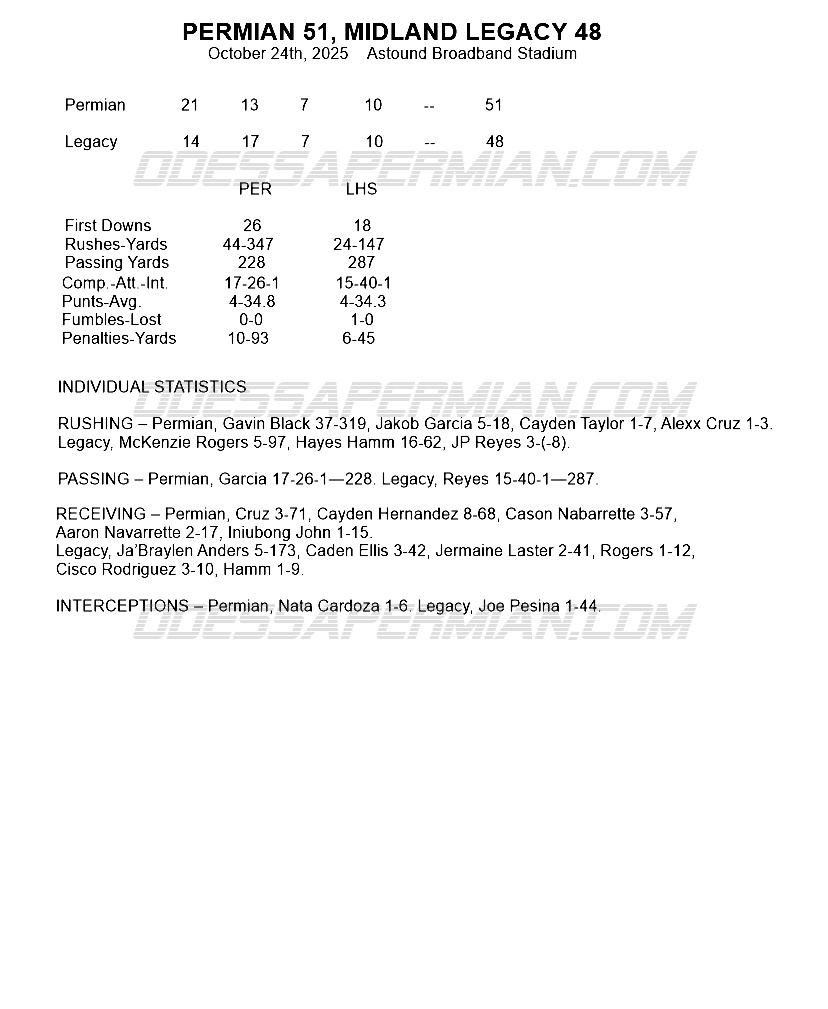 Gavin Black ended the evening with 27 carries for 183 yards and two touchdowns. Jakob Garcia was 24-of-32 passing for 244 yards and a touchdown. Aaron Navarette led Permian receivers with eight catches for 80 yards. Defensively, Cameron Mattingly and Izeyah McCoy had interceptions.