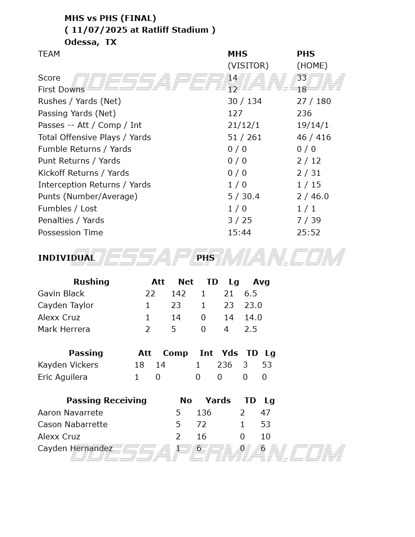 Gavin Black led the way for MOJO with 161 yards and three scores on 24 carries. Jakob Garcia and Kayden Vickers combined for 318 passing yards. Cason Nabarrette led Permian with six catches for 142 yards and a score. Cameron Mattingly grabbed an interception and returned it for a touchdown. The win gives MOJO a 4-0 record in District 2-6A (8-1 overall) and a share of the district championship.